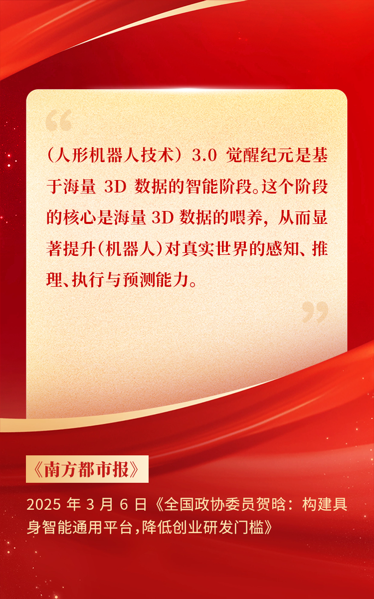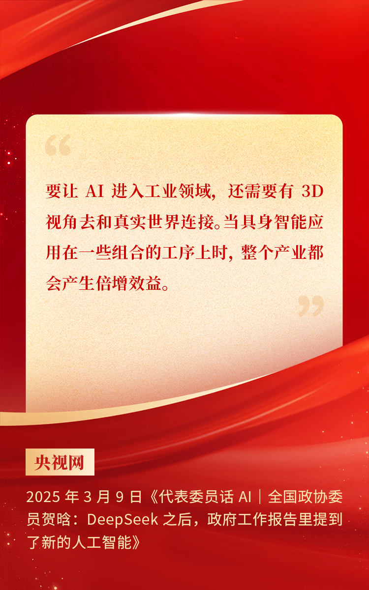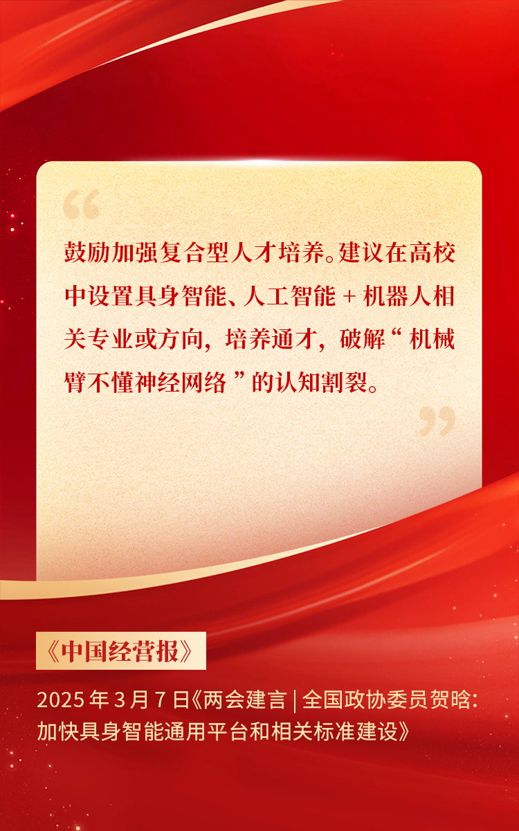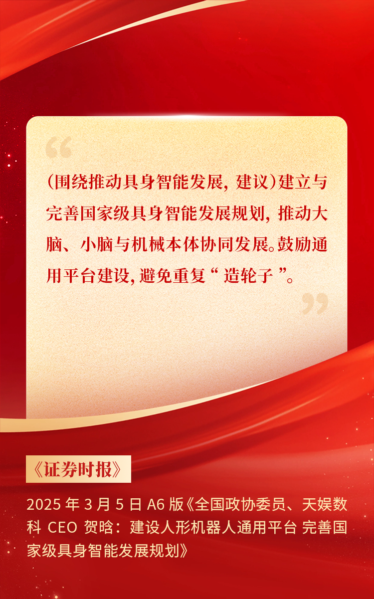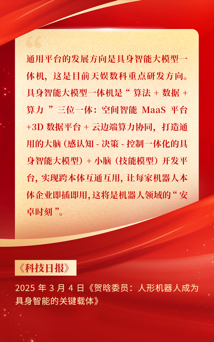 全國政協(xié)委員、天娛數(shù)科CEO賀晗連續(xù)第三年上會履職,圍繞“具身智能”“人形機(jī)器人”“人工智能產(chǎn)業(yè)”等熱詞積極建言,受到了媒體的廣泛關(guān)注,吸引了來自央視網(wǎng)、經(jīng)濟(jì)參考報(bào)、中國電子報(bào)、第一財(cái)經(jīng)日報(bào)等央黨媒體、主流財(cái)經(jīng)等媒體記者的專訪報(bào)道,讓我們一起回顧賀晗委員兩會建言!